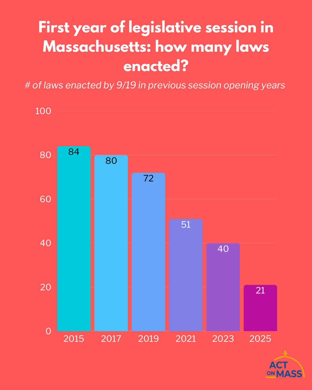 Short answer: no. We’re not only proceeding at about half the speed of last year’s session, which ended with procrastination chaos, but we are passing laws at roughly ¼ of the rate we were a decade ago. Not to mention that this session has coincided with the new Trump administration undermining civil liberties and targeting Massachusetts. You'd think that might prompt some urgency!